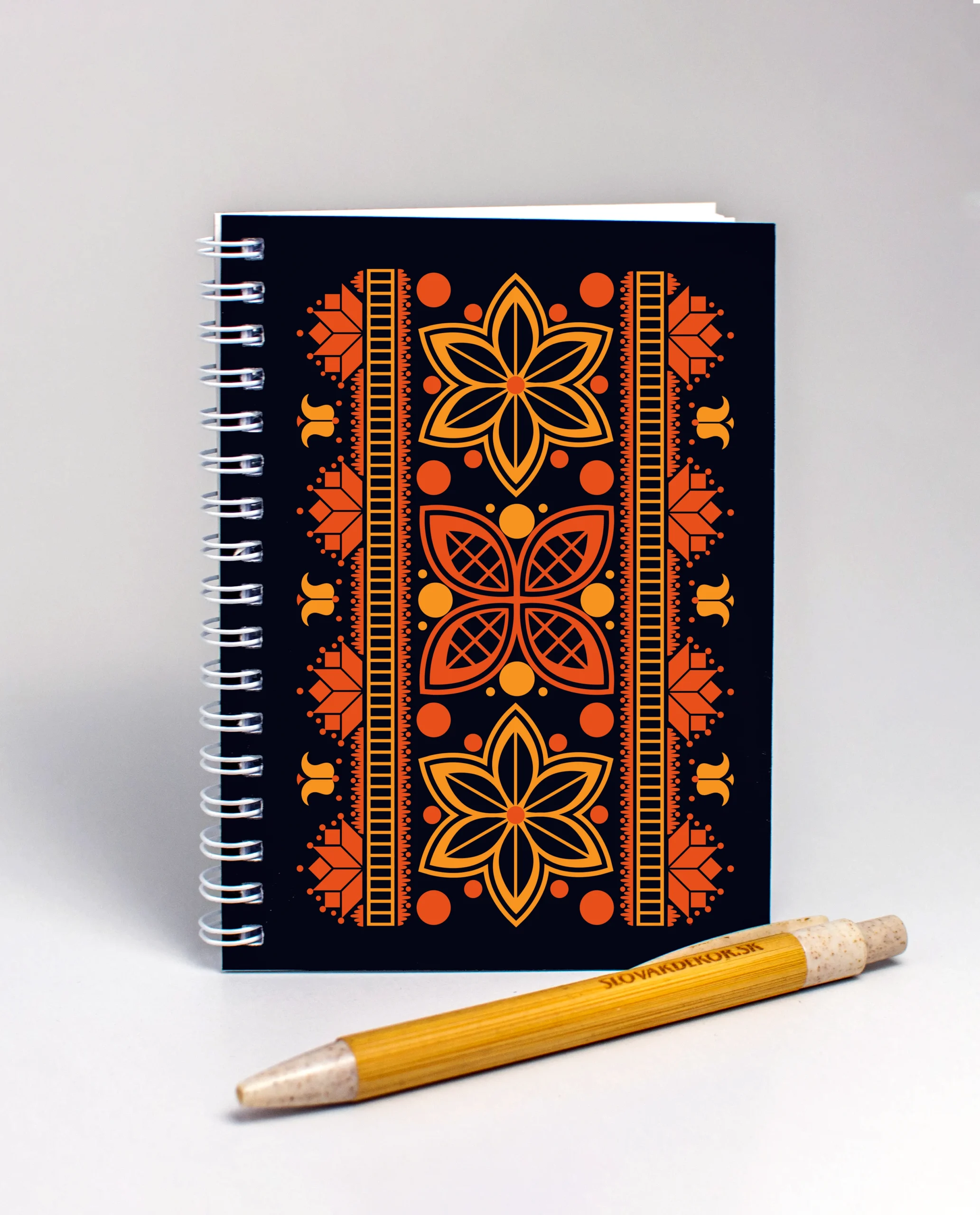 Detvianske vzory patria medzi najikonickejšie prvky slovenského ľudového umenia. Sú charakteristické jasnými farbami, detailnou ornamentikou a symbolikou, ktorá odráža bohatú históriu regiónu Detva. Tento notes v sebe nesie práve tieto prvky – tradičné kvetinové a geometrické vzory, ktoré sú prispôsobené modernému dizajnu. Vďaka tomu vznikol produkt, ktorý je nielen krásny, ale aj praktický.
