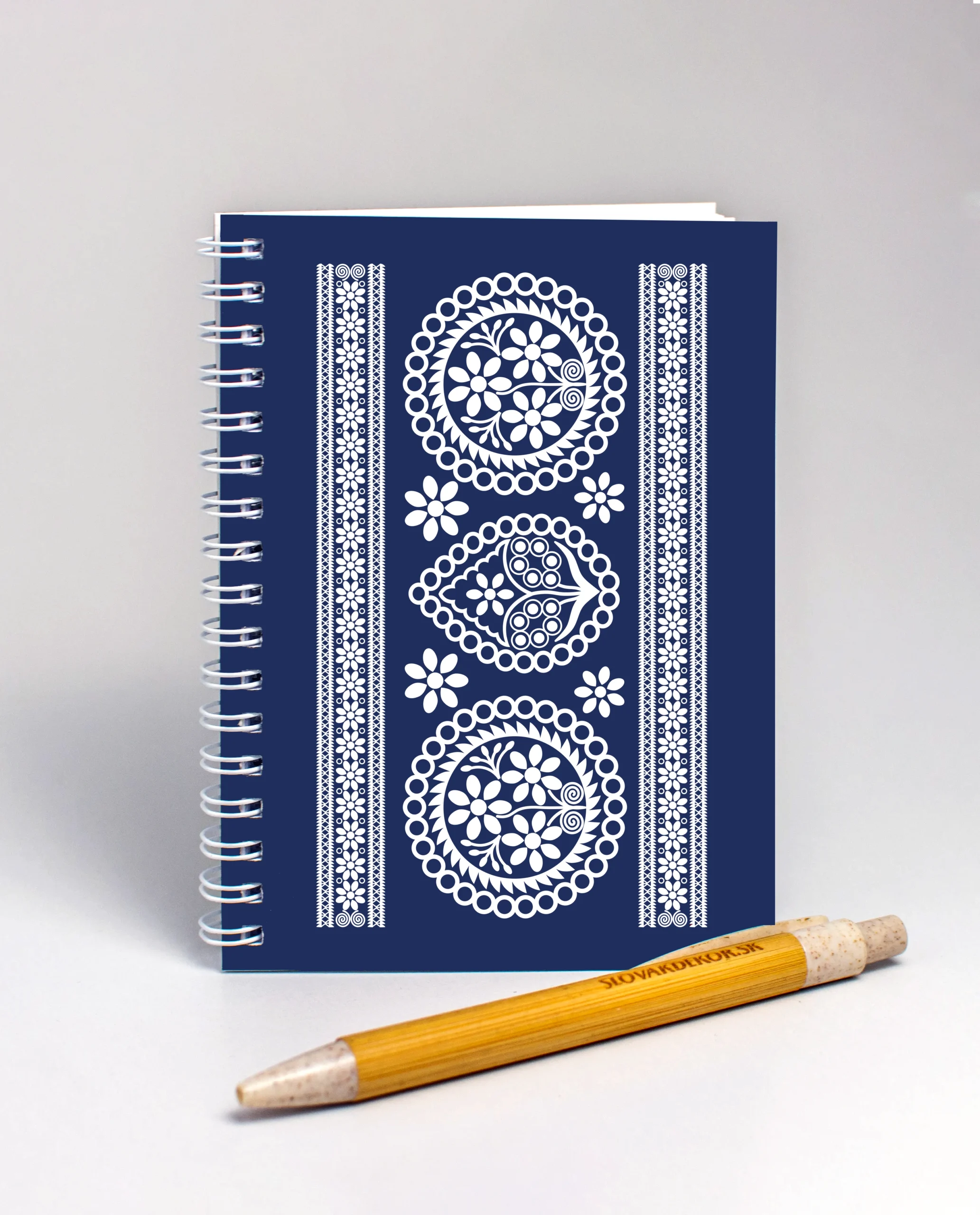 Ľudový motív z Piešťan – odkaz na bohatú históriu Piešťany, známe nielen ako významné kúpeľné mesto, ale aj ako centrum folklóru a tradičného remesla, sú domovom unikátnych ľudových vzorov. Tento notes zdobí autentická potlač inšpirovaná piešťanskými ornamentmi, ktoré sú charakteristické svojimi jemnými kvetinovými a geometrickými prvkami. Každý detail dizajnu bol starostlivo vybraný tak, aby odrážal krásu a eleganciu tradičného slovenského umenia.